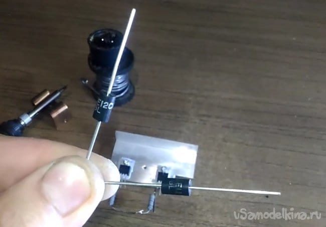 Необходимо припаять анод диода (значок треугольничка) к левой ноге транзистора.