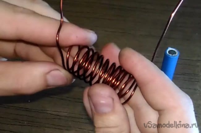 Шаг 1: Намотка катушки. Первым делом намотаем провод 1.4мм2 на "форму" (еще раз напомню что в качестве "формы" я буду использовать аккумулятор формата 18650) что-бы получить катушку.