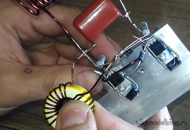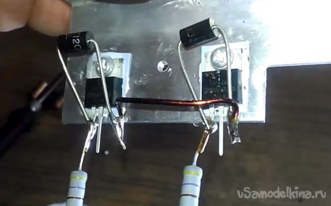 Её концы необходимо припаять к стокам транзисторов (центральные ноги транзисторов).