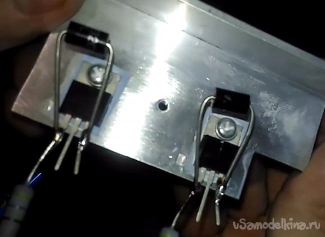 Так же проделываем и со вторым транзистором. Таким образом на данном этапе уже имеется 2 транзистора прикрученных к радиатору и готовых к дальнейшей пайки.