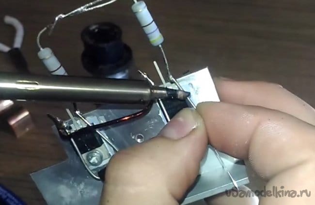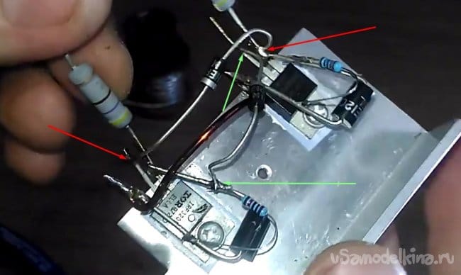 Вслед за этим с каждой стороны транзистора его нужно припаять к общей точке соединения резистором на 220 Ом и место куда паяли конденсатор.