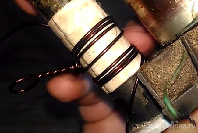 Дальше мотаете остальные 3 витка (и лично я обвязал конец вокруг этого "отвода" для того что бы катушка не раскрутилась)
