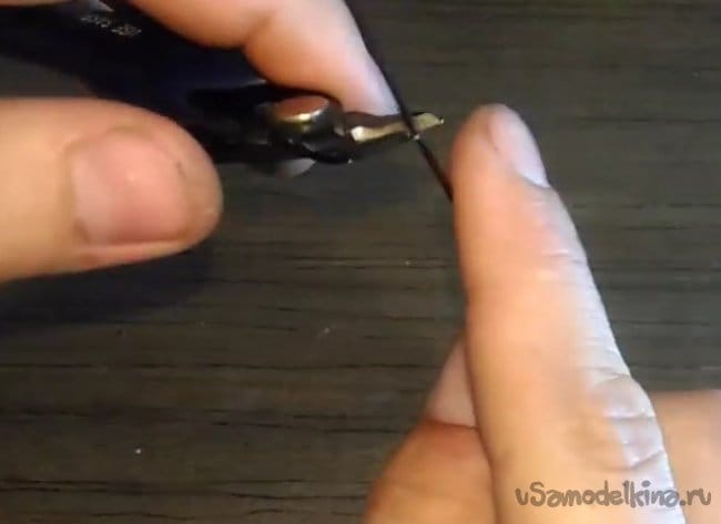 После откусываем лишний кусок (он еще нам пригодится) провода бокорезами.