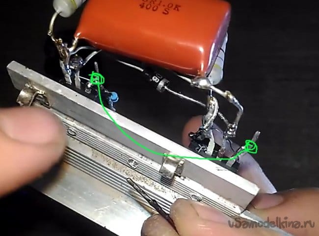 Его припаиваем параллельна стокам (центральным ножкам) транзисторов.