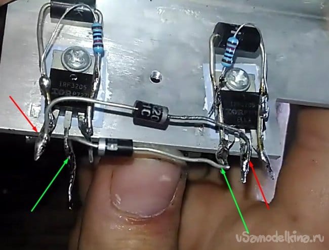 Затем паяем диоды. Анод диода ("плюс") к затвору левого транзистора, а катод ("минус") к стоку правого транзистора.