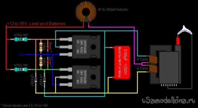 Один из транзисторов открывается и качает одно плечё обмотки, потом он закрывается и уже другой открывается, так же качает другое плечо обмотки и все это на частоте 30кГц.На выходе получаем "жирную" дугу которая способна "тянутся" до 3см (при питании от 16В - 5см)!