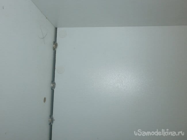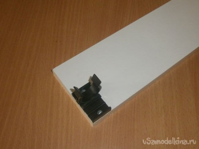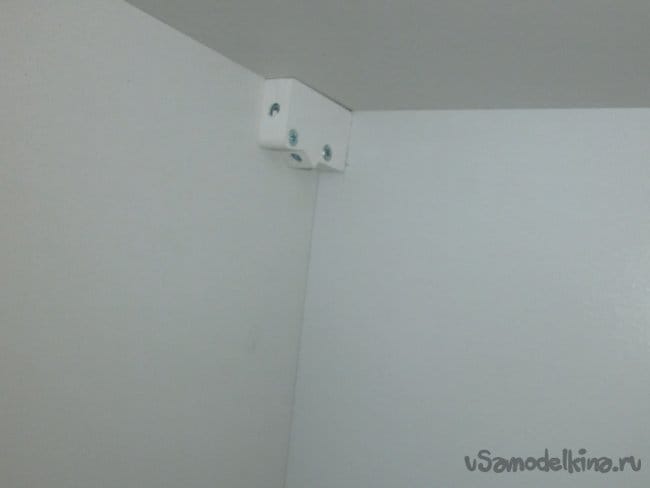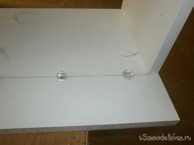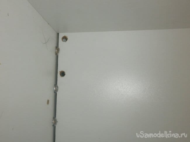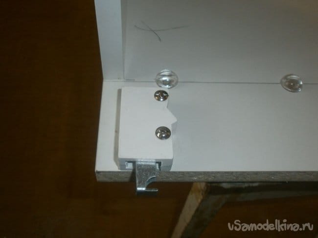 Навесы. Отступаем 16 мм, чтобы они все были в ряд, сверлим отверстия сверлом пятёркой два отверстия в ДСП, рассверливаем отверстия в самих навесах, и на «маме» стяжного болта, крепим их.