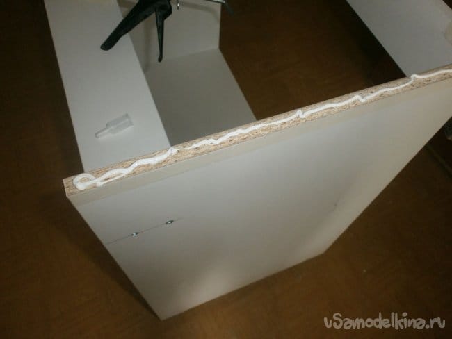 Также поступаем и со столешницей: а пока герметик не застыл, прикручиваем к столешнице боковые заглушки,