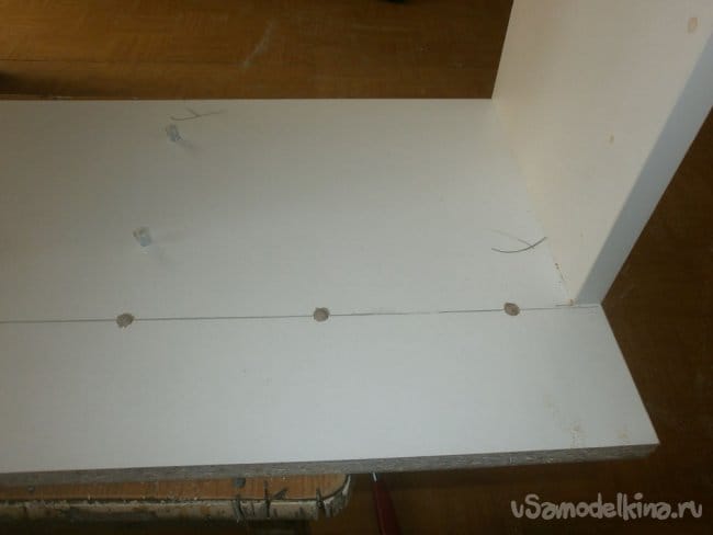 Сперва всё просто: размечаем и засверливаем отверстия под конфирматы и упоры для съёмных полок.