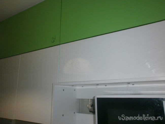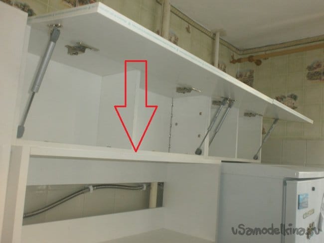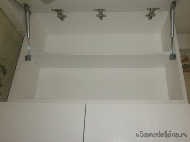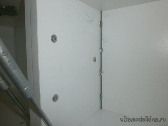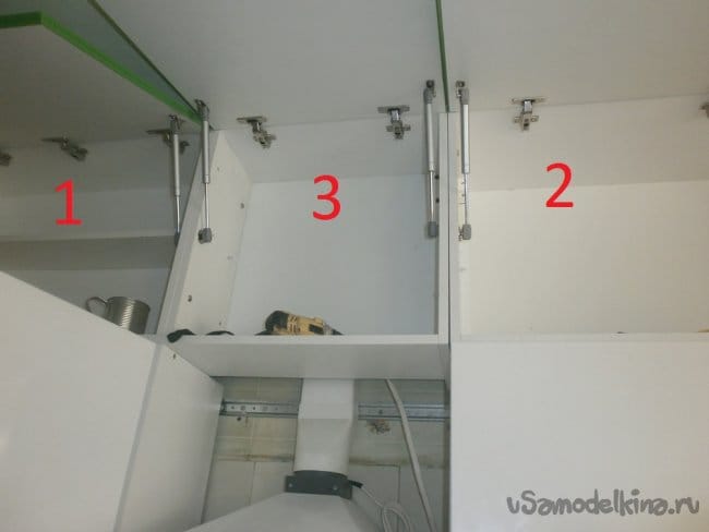 Но только не торопитесь прибивать заднюю стенку шкафов. Регулировать газовые упоры фасадов, открывающихся вверх, проще без неё.