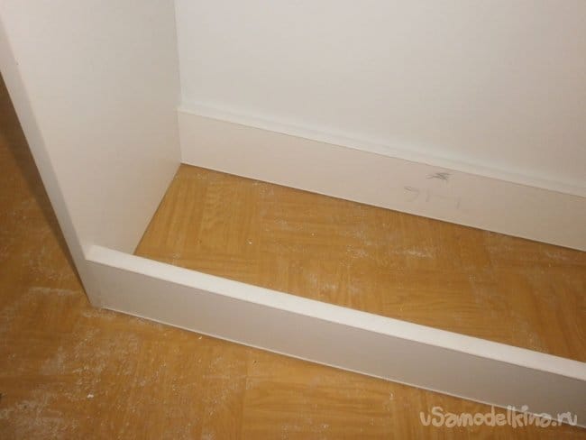 При этом фасадные ножки немного утопил, на пару сантиметров, тогда как дальние вкручивал под срез: так шкаф будет максимально устойчивым.