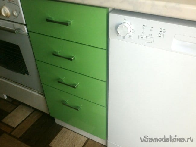 Вот и всё. Осталось снять защитную плёнку с фасадов (сын сделал это), наклеить силиконовые демпферы-кружочки, чтобы при закрывании двери не сильно бахали, ещё раз их подрегулировать и можно звать супругу принимать сделанную работу.