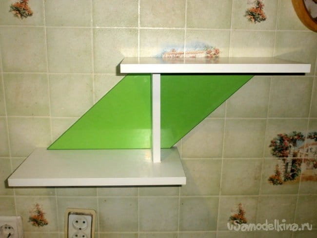 Открытая полочка, чтобы максимально закрыть вытяжку. Пока проектировал, думал просто обойтись двумя горизонтальными полками, но затем передумал. Поэтому сделал вот такую незамысловатую конструкцию: