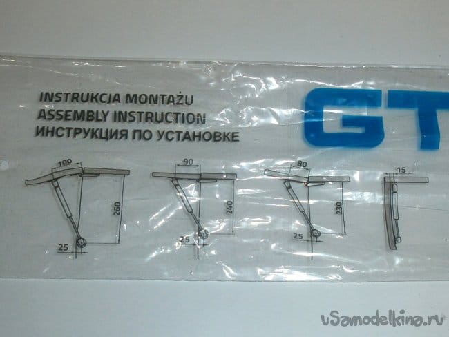 Газовые упоры для дверок, открываемых вверх. Не буду рекламировать производителя, но на упаковке каждой из них нарисована инструкция по установке, понятная даже «чайнику», к которым я себя и причисляю.