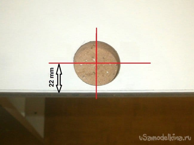 отступив 22 мм от края, специальным сверлом-фрезой диаметром 35 мм делаю отверстие,