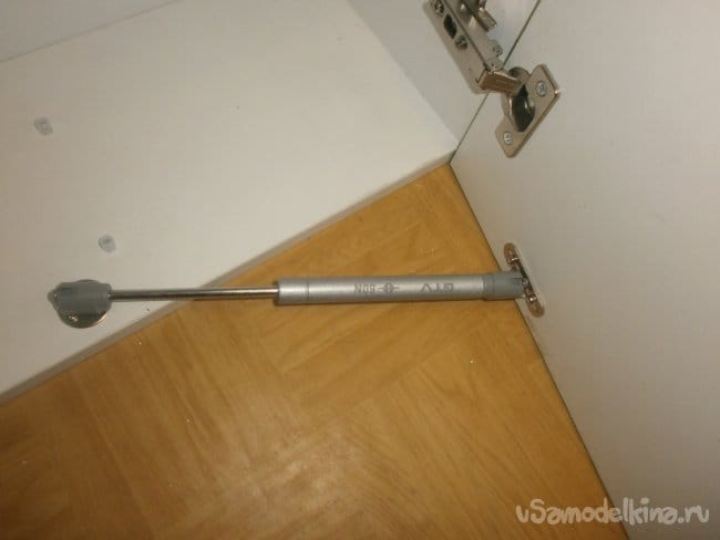 Такую же операцию по прикручиванию дверок и установке газовых упоров повторяете много раз, пока все шкафчики не будут готовы.