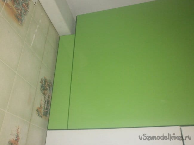 Узкий шкафчик-нычка под каналом вытяжки. Фасад заказал заранее, а вот как её сделать, не думал. Поэтому поступил просто: квадратик, который просто будет стоять на полке-сушке.