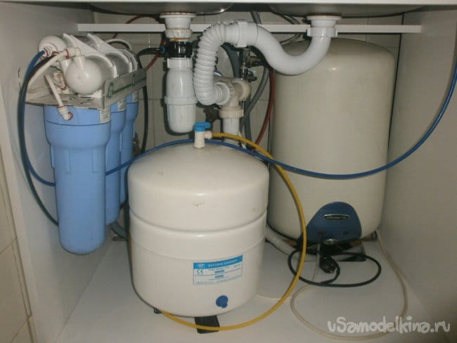 • В тумбе-мойке должны уместиться бойлер на 20 литров, осмос для очистки с бачком запаса воды на 5 литров. А по возможности – ещё и мусорное ведро.