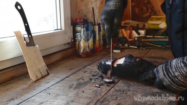 Не сдирая коры, обжигаем ствол на костре. Периодически остужаем в воде. Дерево не должно гореть.
