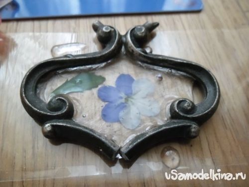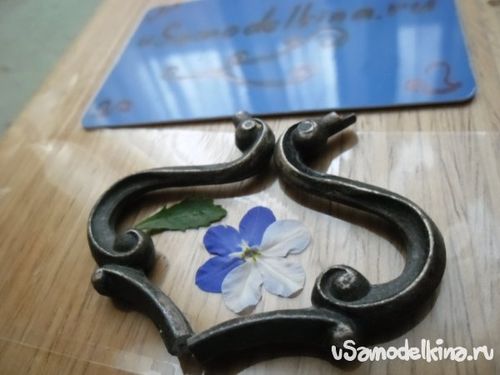 О получившихся подобных поделках я уже рассказывал в статье «Украшения из эпоксидной смолы». Но первые варианты работ были далеки от тех результатов. Получив бесценный опыт, я все-таки научился грамотно пользоваться приемом с эпоксидной смолой. А вот какие ошибки я допускал в начале изготовления поделок, я сейчас расскажу. Вот я подобрал каркас – вместо проволоки я разделил напополам старую ручку от шкафа.