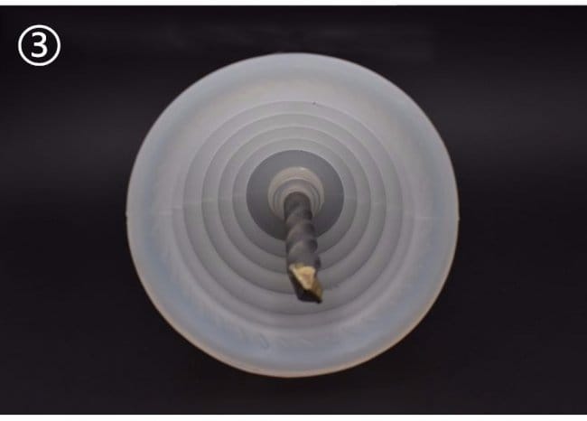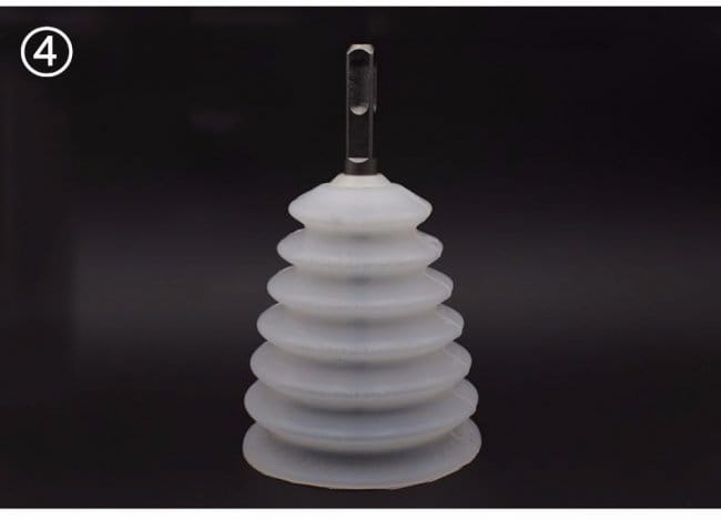 Пыльник представляет собой резиновый кожух, надежно фиксирующийся на сверле (подходит для свёрл диаметром от 6мм до 14мм). Принцип действия приспособления предельно прост - во время работы кожух ограничивает область рассеивания пыли и засасывает ее при нажатии на него по принципу вантуза. Для подготовки к работе на сверло помещается резиновая прокладка (в комплекте идет 4 штуки) на расстоянии ~3мм от хвостовика, далее на сверло надевается сам кожух (более наглядно процесс установки приспособления представлен на картинках ниже). Отметим, что после установки пыльник рекомендуется прижать к корпусу электроинструмента для достижения максимально плотного соединения.