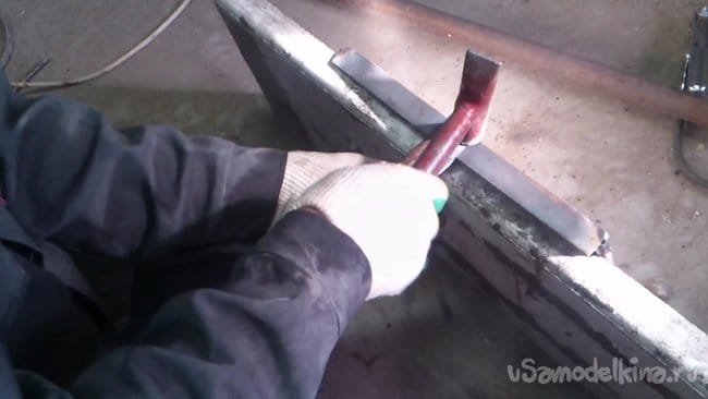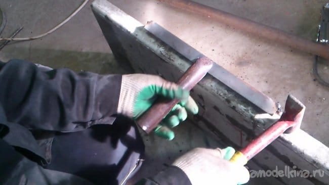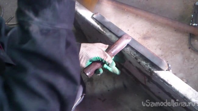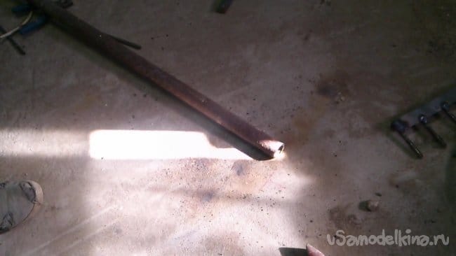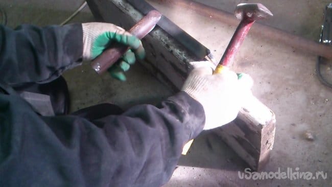 После этого перевернул грабли, и, используя всё ту-же доску в качестве упора, приплюснул оставшуюся часть трубы "ударно-молоточным методом", тем самым заглушив её торец: