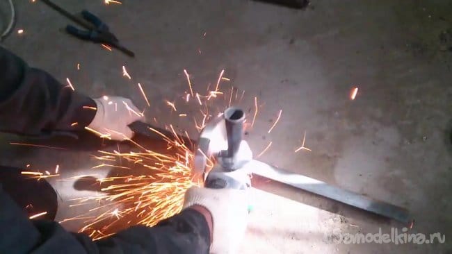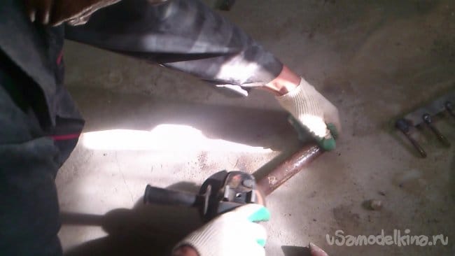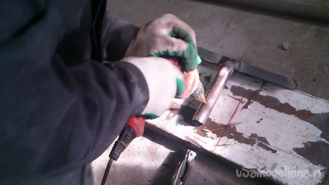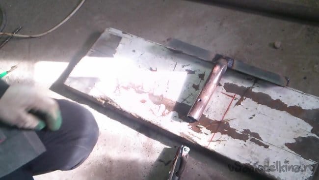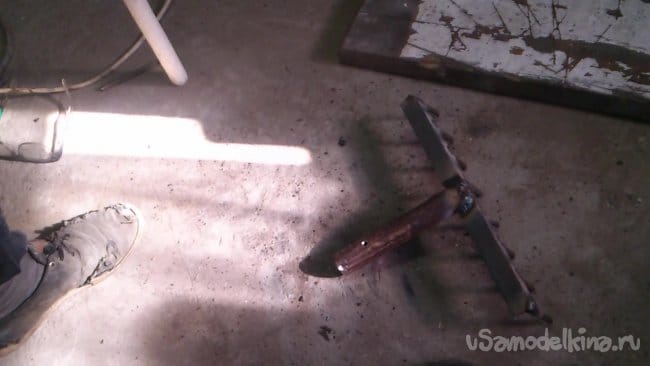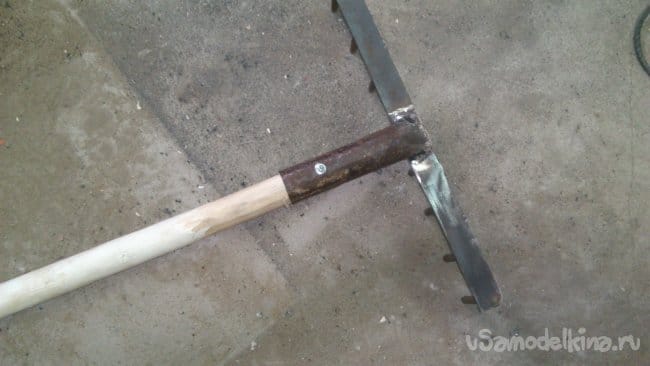 Одел этот отрезок трубы этим вырезом на уголок, оставив вырезанный по углом сектор в верхней части грабель. А с нижней стороны, там где вырез плотно прилегал к уголку, приварил сплошным швом: