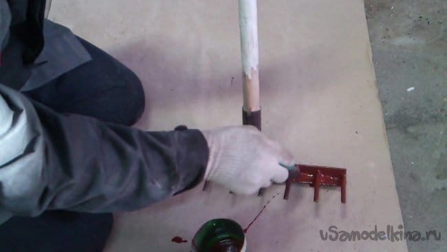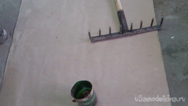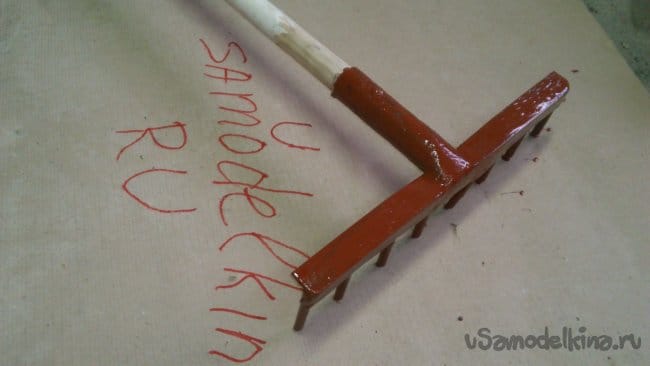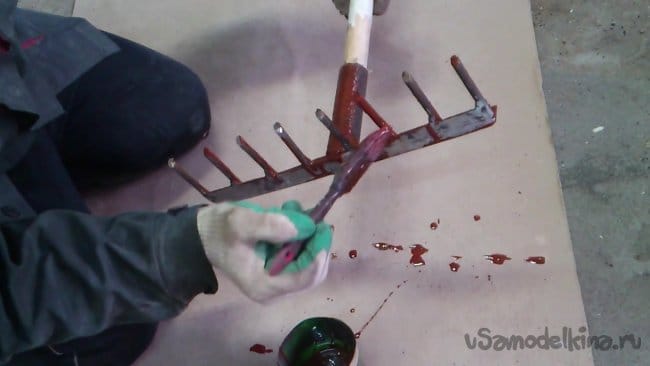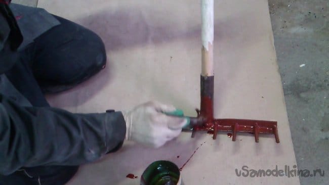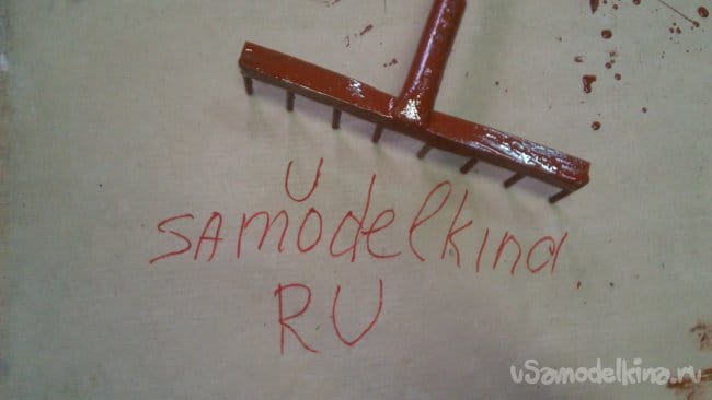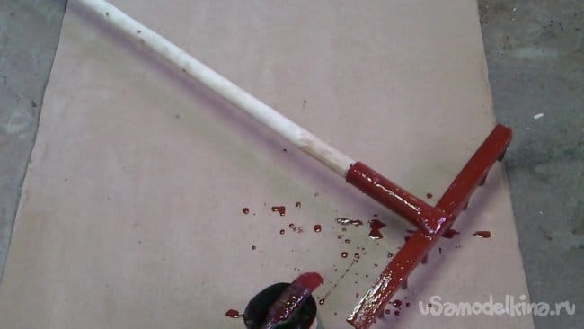Посмотрел на часы... Время ещё есть (Весь процесс изготовления занял около двадцати минут). Решил уже "довести" до конца, придать, так сказать, законченный вид. У меня в запасе всегда есть грунтовка для металла - так называемый, "корабельный сурик". Вот им я и решил покрасить своё изделие. Надо бы было сделать это до вворачивания шурупа...Или, вывернуть его, покрасить грабли, и опять ввернуть... Но очень уж сильно не хотелось.))) Так что я просто прикрасил всё, вместе с шурупом...