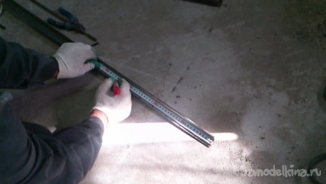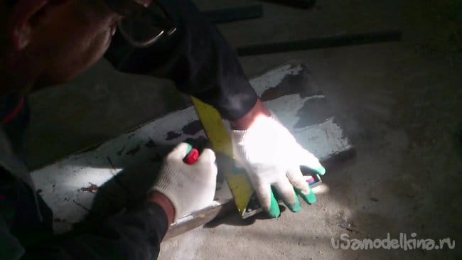Затем я занялся изготовлением зубьев. Чтобы все они получились одинаковой длины, я решил их нарезать по шаблону. Так как работал "на коленке", а не в условиях мастерской, то просто нашёл на улице кусок старой доски, На ней нарисовал перпендикулярную краю линию, отметил от края нужную мне длину (прикинул, что это будет 70 мм), и отрезал будущие зубья, прикладывая заготовку к этому шаблону: