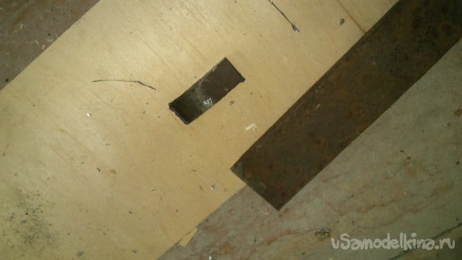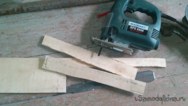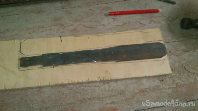 нашёл обрезки фанеры, толщиной 10 мм. Используя металлическую часть как шаблон, разметил, а потом вырезал электролобзиком две будущих накладки. При этом, вырезал тоже грубо - не точно по контуру, а с запасом: