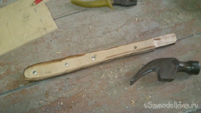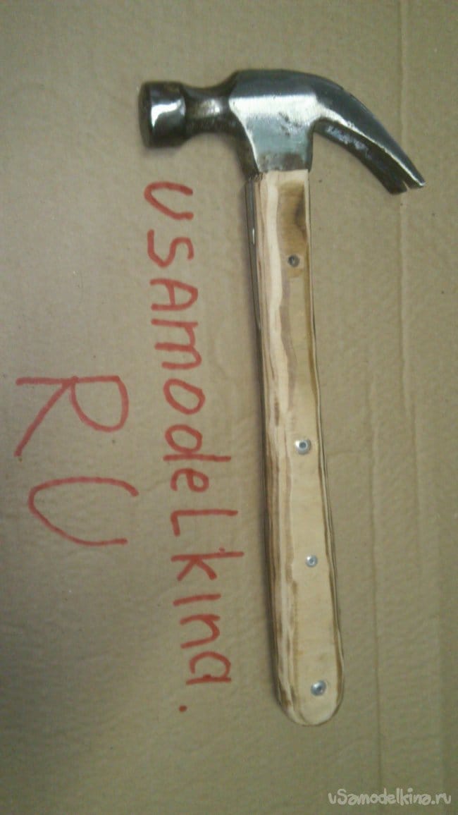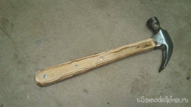 Как уже писал, такая конструкция рукоятки очень удачна, как показала практика. Рукоятка не особо утяжеляется, поэтому, молоток сохраняет свои "ударные свойства" практически полностью. В то-же время, металлическая полоса "на ребро" вместе с фанерой, способны выдерживать значительно большие нагрузки, чем штырь круглого сечения, и уж, тем более, простое дерево.