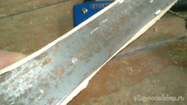 С другой стороны я приклепал вторую накладку. Сверлил дрелью сквозь фанеру сразу в металл. Когда чувствовал, что металл пройден - ставил заклёпку тем-же методом. После того, как закрепил, просверлил насквозь два отверстия, диаметром 5 мм, и стянул весь "бутерброд" имеющимися двумя большими заклёпками. При этом тоже с обоих сторон засверлил большим диаметром. С одной стороны в эту "лунку" помещалась шляпка, с другой - одетая на заклёпку шайба М5.