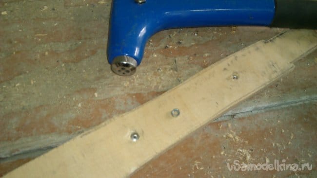 Даже так длины заклёпок не хватало. Но я чуть заглубил их в фанеру, рассверлив немного под шляпки сверлом большого диаметра. При установке появились опять трудности - имеющийся на стройке заклёпочник был той конструкции, которая не имеет "носика"!!! Поэтому он не доставал до заглублённой в дерево шляпки заклёпки.. Я решил эту проблему, одевая на стержень кольцо, которое отрезал от резьбой заклёпки подходящего диаметра: