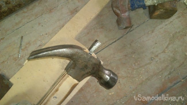 Осталось забить клин на место. Как вы помните, в металлической части я заранее сделал разрез под него, а фанеру он и сам расколет: