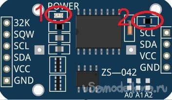 5. Модуль часов DS3231, нужен для более точного отсчета времени. Светодиод Power (1) отпаян у модуля DS3231. Сделано это для целей энергосбережения. Если вы используете обычные батарейки (не аккумуляторные), то нужно отпаять резистор (2). Модуль рассчитан на аккумуляторные батарейке в том числе заряжает их. Если батарея обычная, зарядный ток быстро приведет ее в негодность.