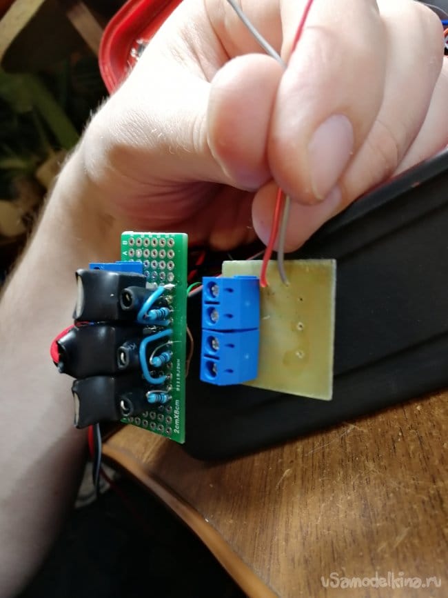 7. Управление помпы осуществляется через полевые транзисторы. Подойдут любые, которые открываются 5В напряжением и способны коммутировать ток от 1А. Сначала я использовал готовые. Я спаял батарею из полевых транзисторов + резисторы (100 Ом для защиты Arduino, 10к Ом для подтягивания затвора транзистора к земле, чтобы мосфет закрывался)+ также припаял разъемы KF 301-2P для фиксации проводов