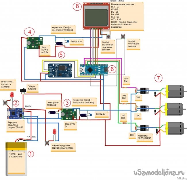 3. Далее через выключатель подключен повышающий преобразователь до 5В. Он будет питать большую часть компонентов схемы, включая помпы. С падением уровня заряда аккумуляторов напряжение снизится с 4,2В до 2,7В, что для работы схемы не достаточно. Модуль обеспечит стабильное напряжение. На выход модуля ставится фильтр из электролитического и керамического конденсаторов. Электролитический конденсатор выполняет сглаживающую, стабилизирующую роль. Керамический конденсатор служит для борьбы с высокочастотными помехами. Если у модуля «пищит» дроссель во время работы, для устранения этого явления можно поставить ещё дополнительный электролитический конденсатор на вход модуля. Электролитические конденсаторы емкостью 1000 мкФ на 6,3В. Керамические конденсаторы подойдут от 1-2 мкФ. В схеме использованы на 10 мкФ, потому, что у меня было много лишних.