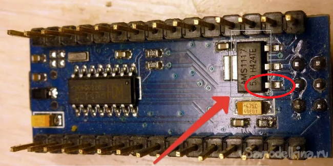 6. Основной мозг системы – платформа Arduino nano. Для целей энергосбережения нужно отпаять все светодиоды (или хотя бы только Power), а также откусить левую ногу стабилизатора напряжения.