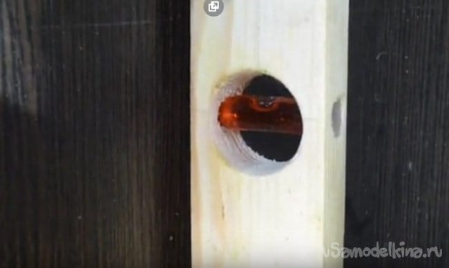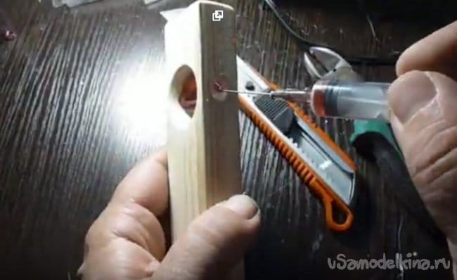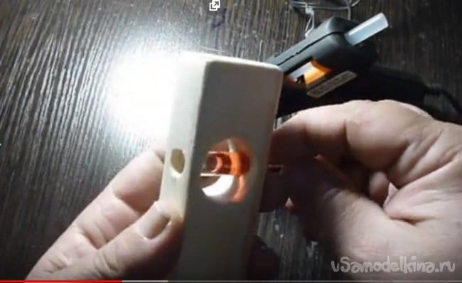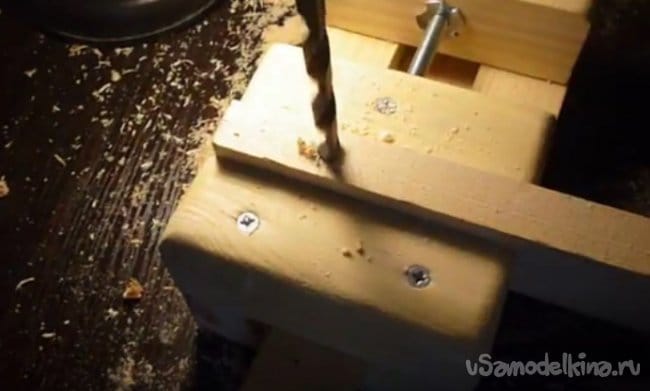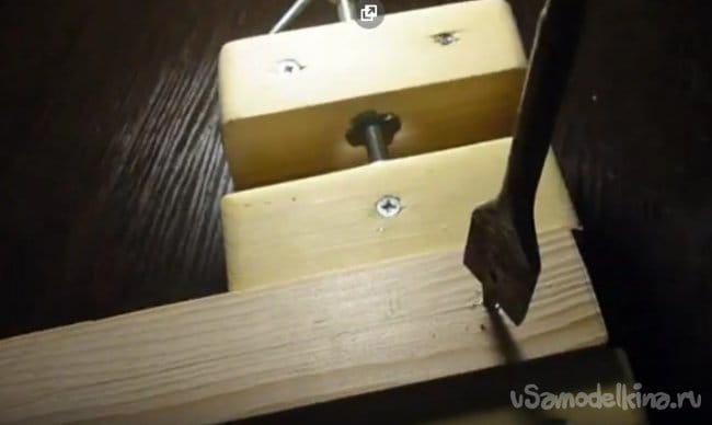 - С помощью перьевого сверла сверлим два отверстия(показано в видео), у нас сверло двадцать четыре миллиметра.