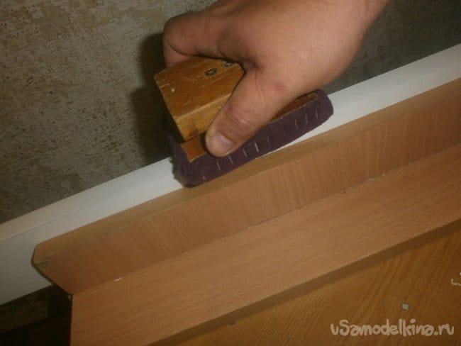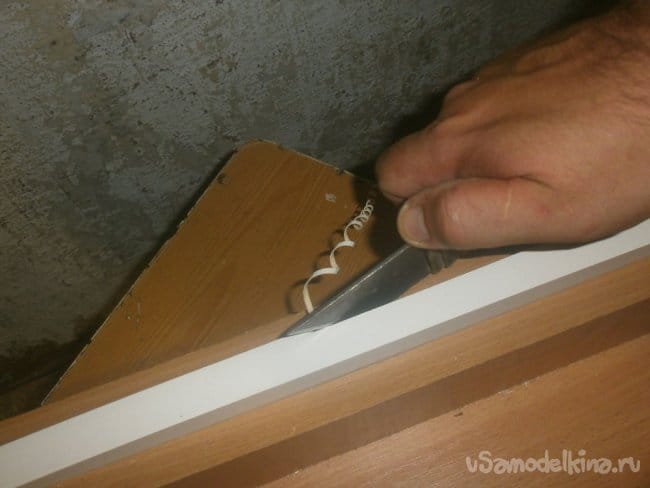 Излишки кромки срезаем ножом. Только не берите слишком острый: повредите внешний слой на ДСП. А так, кромка бумажная, его хватит «за глаза». Одна деталь готова, также поступаем и с остальными.