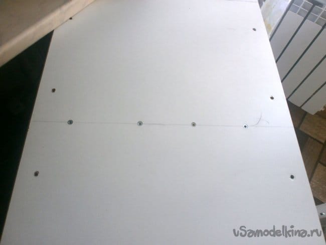 Но ничего сложного, для приведённых размеров это 408 мм от левого края, прямая линия, и по ней 4 конфирмата.