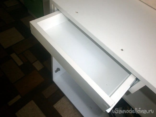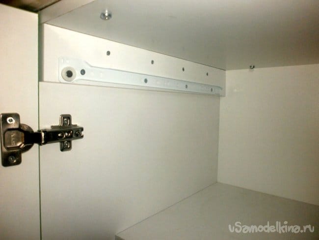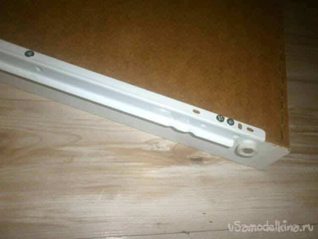 Её приворачиваем к боковой детали шкафа. Без неё ящик не будет выдвигаться: мешает открытая дверца. Сама деталь по ширине такая же, как сам шкаф: так проще прикручивать, даже размечать ничего не придётся.