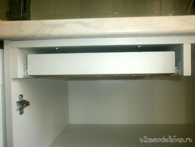 Но когда немного попользовался, выявил одну недоработку: полочку не за что выкатывать. Внешней ручки у неё нет. Поэтому хлястик от чего то, вроде от зонтика, одел на саморез с колечком на конце и зажал его.