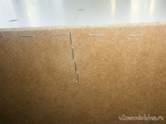 А чтобы конструкция была ещё более ровной, пристреливаем скобами, или прибиваем мебельными гвоздями заднюю оргалитовую стойку. Там, где стоит направляющая для полозьев.
