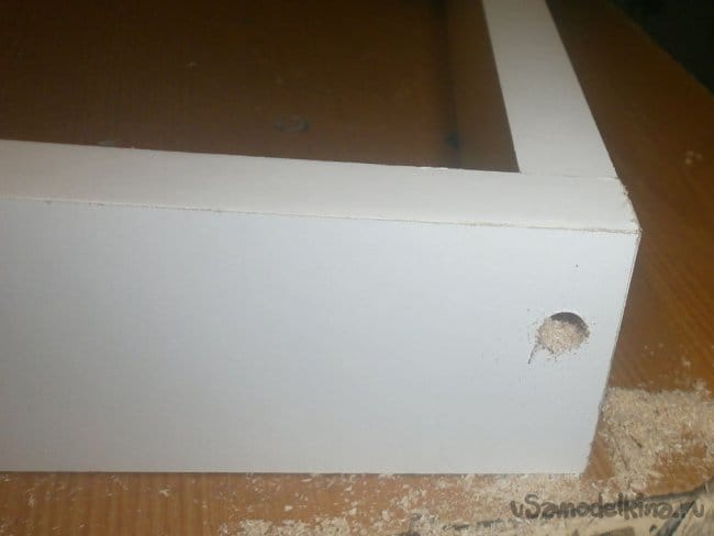 Собираем коробочку ящика. Приставляем две детали, сверлим отверстие, по одному на сторону хватит,
