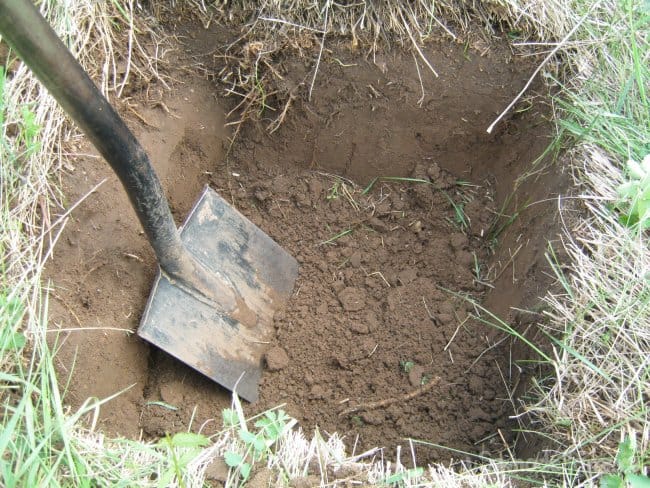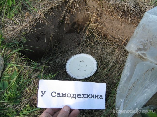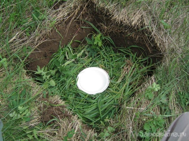 Подобрали небольшой кусок целой полиэтиленовой пленки, отмыли его и высушили на солнышке. Подобрали место рядом с домом, открытое солнечное, так чтобы не угодить в него по рассеянности и в то же время не далеко. Вырубили контур ямки в дерне. Выкопали ямку немного меньше куска полиэтилена, глубиной на штык лопаты.
