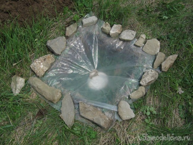 Емкость для испарения отрывается прямо в грунте. Сообразно размерам куска полиэтилена, так, чтобы края пленки немного выступали за периметр нашей ямки.
