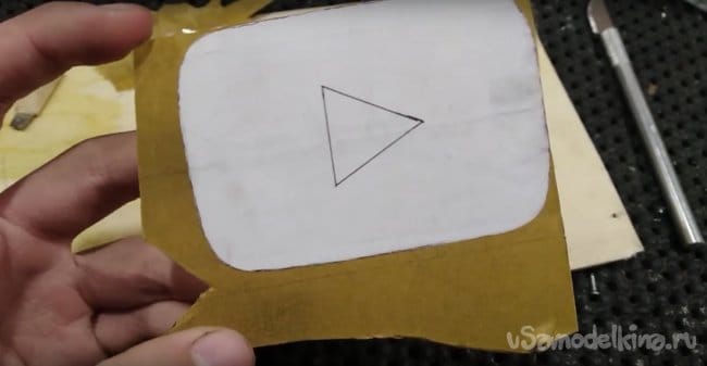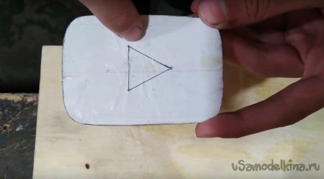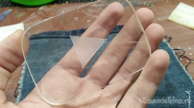 Вырезаем с помощью лобзика, ножовки. Обрабатываем напильником а потом и наждачной бумагой. Наносим керном или шилом точки на треугольнике в нутре фигуры, и сдираем чертеж.