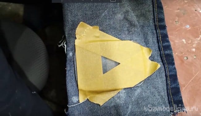 Теперь высушиваем заготовку и по местах кернение треугольника наклеиваем плотный толстый бумажный скотч. Берем наждачную бумагу, у меня на поролоновой основе, та будет лучше, меньше будет сдираться скотч. Шлифуем до матовой поверхности. И сдираем скотч.