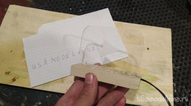 Вот так получается. Нам теперь нужно сделать подставку которая будет светиться. Я беру небольшой отрезок бруска по длине заготовки, недалеко от края делаю прорезь с помощью маленькой стамески. Клею светодиодную ленту, она у меня на 12В, лучше всего на 5 тем самым мы сможем включать ее от usb, и заливаем клеем.
